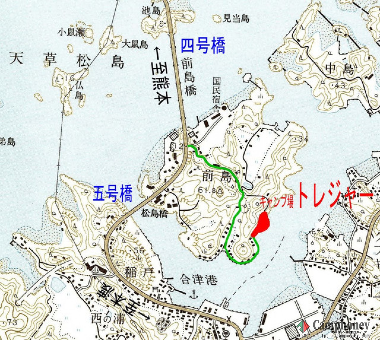 本渡市方面から : 五号橋を渡ってから信号より右折坂道を上がっていき最初の交差点を右折し、海に突き当たったら左折して道なりです。
