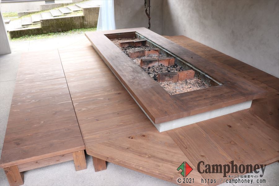 バーベキューサイトの一部に、囲炉裏の雰囲気を楽しんでいただけるよう”囲炉裏棟”を新設しました。