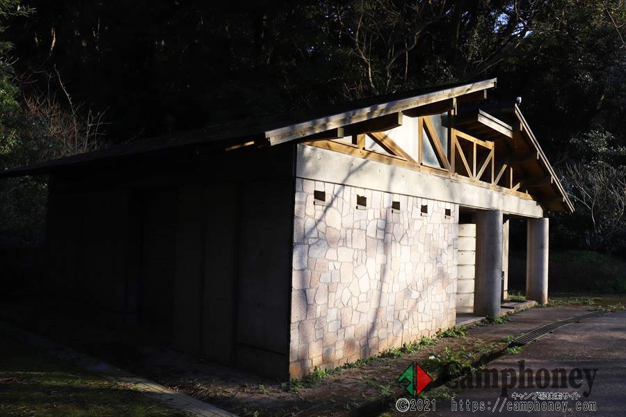 テントサイト、炊事場、トイレ(なかなか立派な作りだが紙なし)