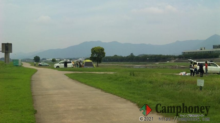 遠賀川の河川敷にある直方リバーサイドパーク、平成3年にオープンして以来、これまでに多くの利用者が訪れた人気無料キャンプ場です。遠賀川のせせらぎと遠くに見える福智・鷹取山地の雄大な眺めは、街にいることを忘れさせてくれます。