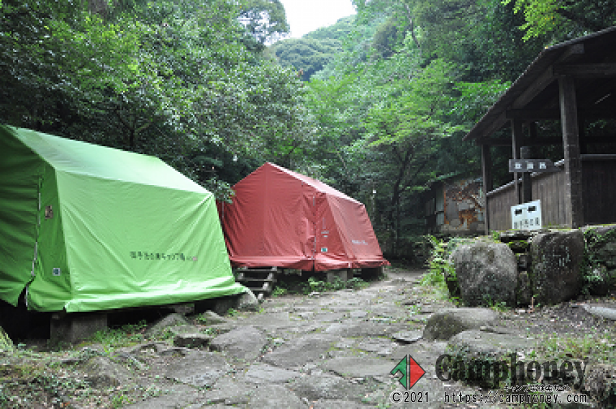 【施設】常設テント(4区画)、持込テント(4区画)、炊事棟(かまど)、水道(井戸)、トイレ完備