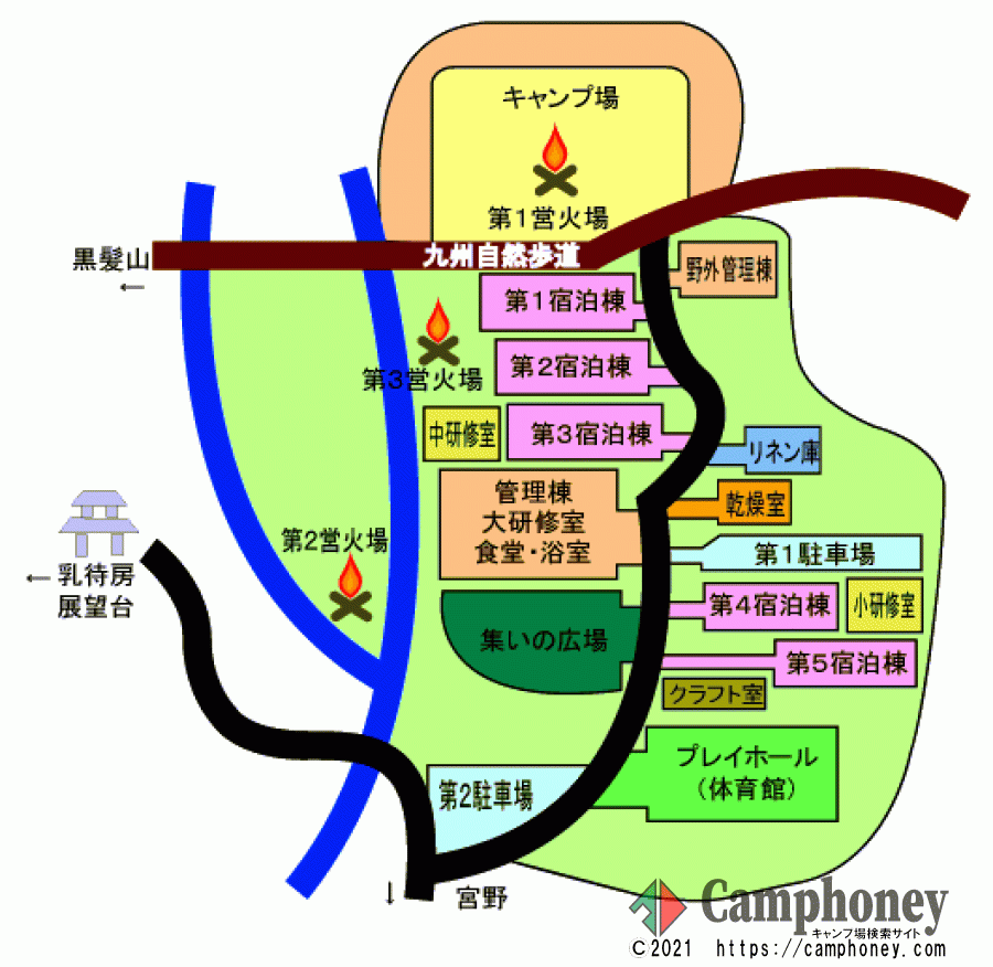 黒髪山系の山ふところ、標高200mに位置しています。豊富な植物と野鳥の群がる素晴らしい自然の環境の中にあります。学校の合宿研修、幼稚園、保育園などでのお泊り保育、部活動などの強化合宿、様々な研修活動などにご利用いただけます。