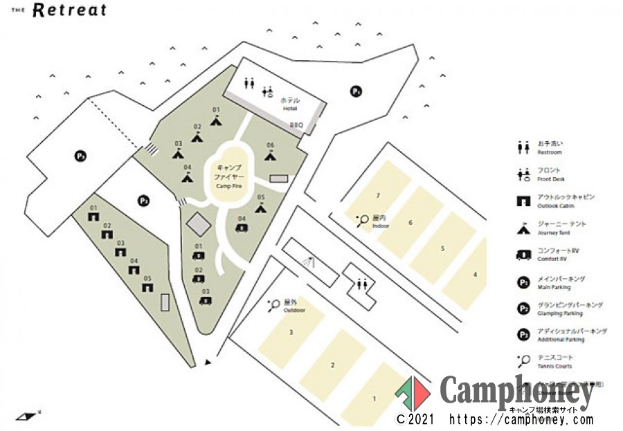 アウトルック・キャビン(コテージ)5棟、ジャーニーテント(テント)6張、コンフォートRV キャンピングトレーラー 4台、マウンテンロッジ(ホテル)15室 (バリアフリー 10室)、合計30室、最大131名収容可能。