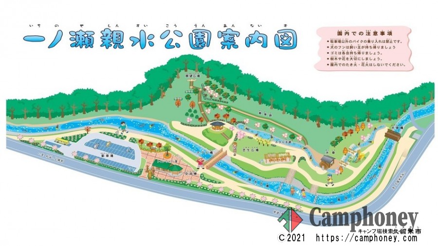 「四季を見る・体験する公園」がテーマの一ノ瀬親水公園では、「春」の訪れをサクラの開花や木々の芽生えを見て感じ、「梅雨入り頃」には以前より生息するホタルが舞う様子(見頃:6月上旬)を観察し、「夏」の暑い時期には涼を求めて賑やかに川遊びに興じ、「秋」には周辺の森林と一体となった紅葉を鑑賞し、「冬」には雪景色を楽しめ、「四季の移り変わり」を体感できます。