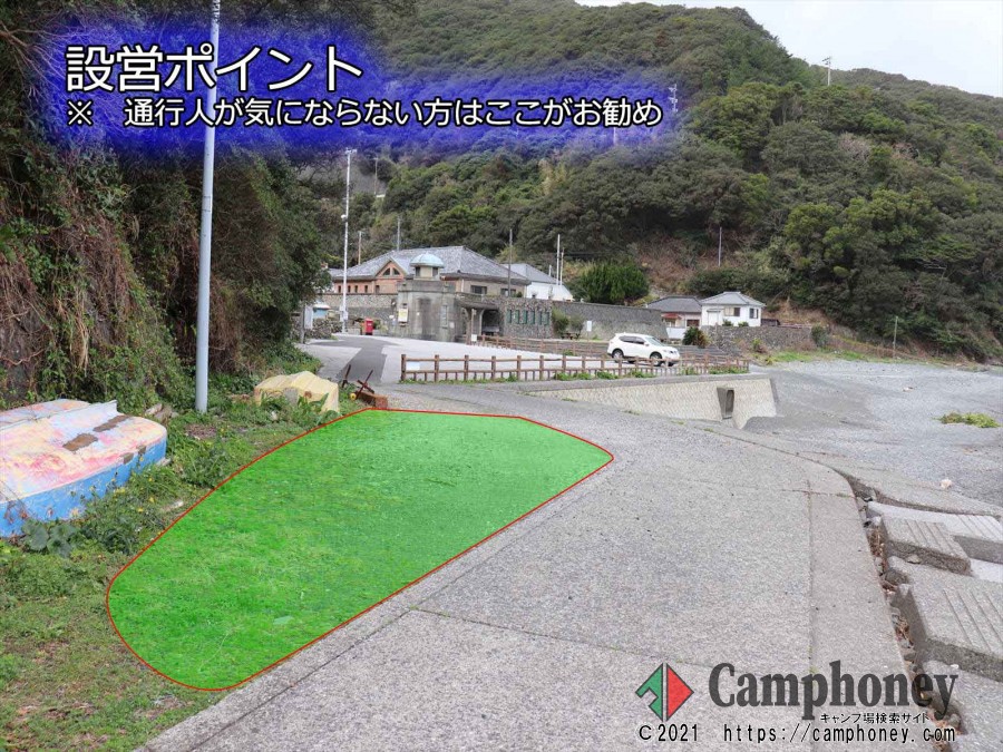 北側海岸にある管理棟横に芝生スペース(設営禁止の看板がありますが、海水浴シーズン以外設営可能です。)があります。また反対側の駐車場奥にテント設営に適した広い土の地面の空地もあります。他にはアスファルト上や小石の砂浜上に設営する方もいます。