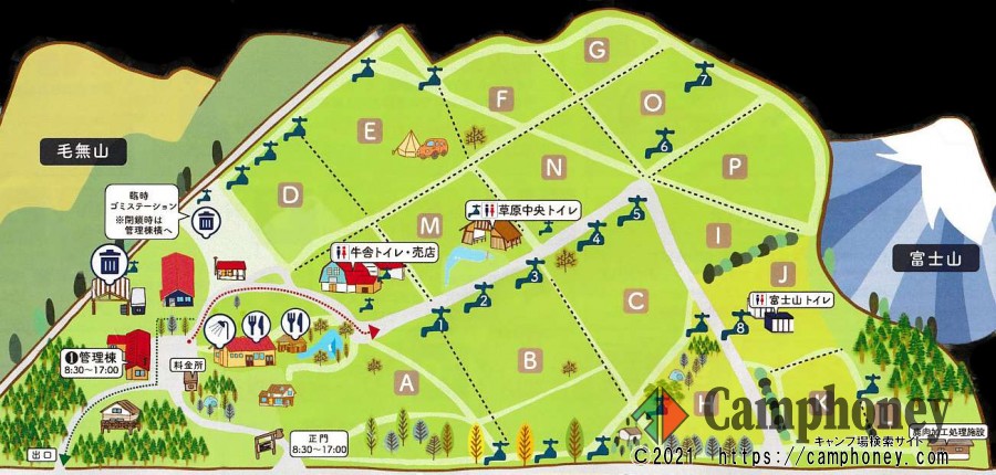 【特にお勧めテントエリア】B,C,E,N(富士山が麓まで見える+周囲の山などが無く開放感満点+中央トイレ近い)