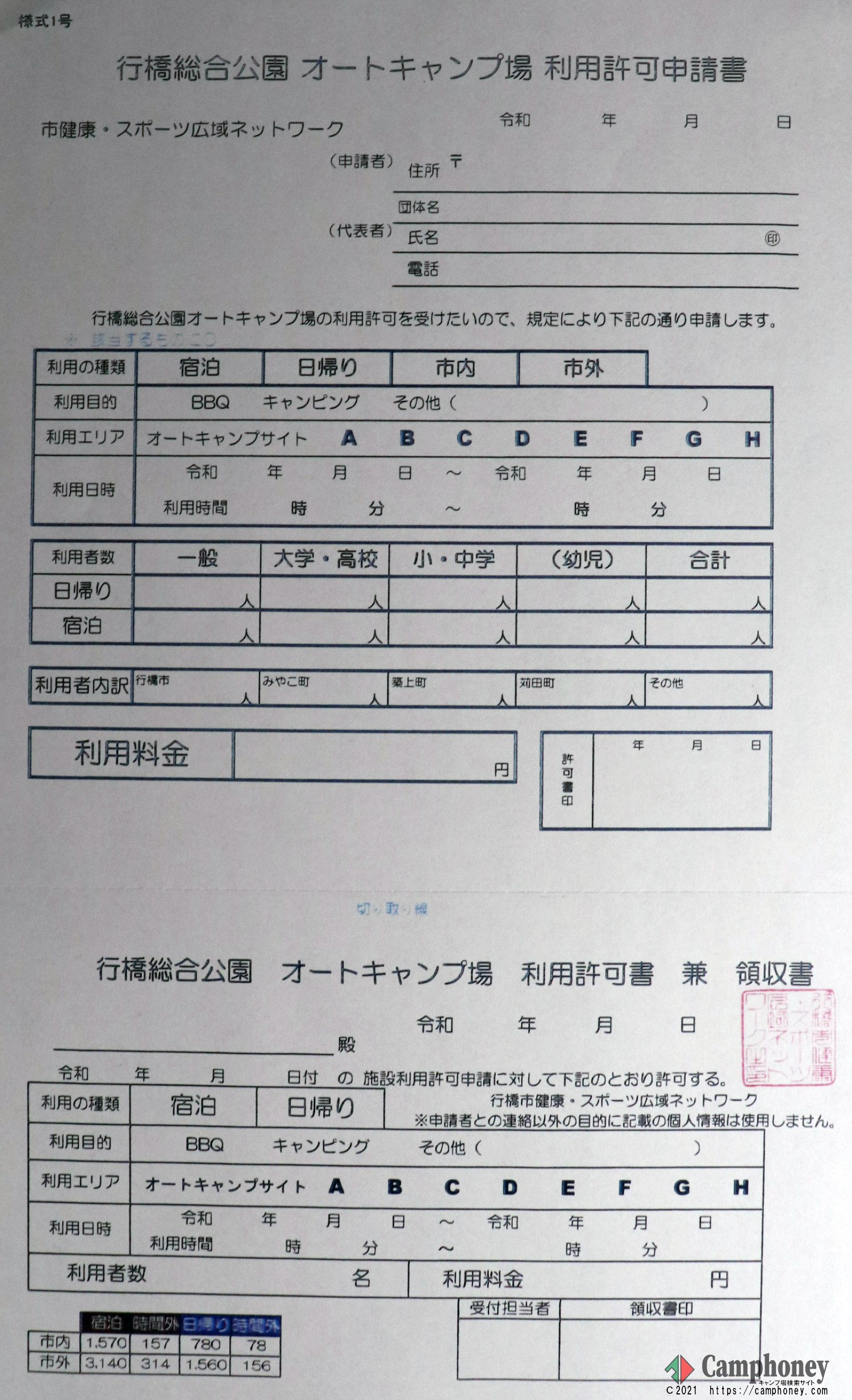 料金表(行橋市研修センター・行橋市オートキャンプ場)