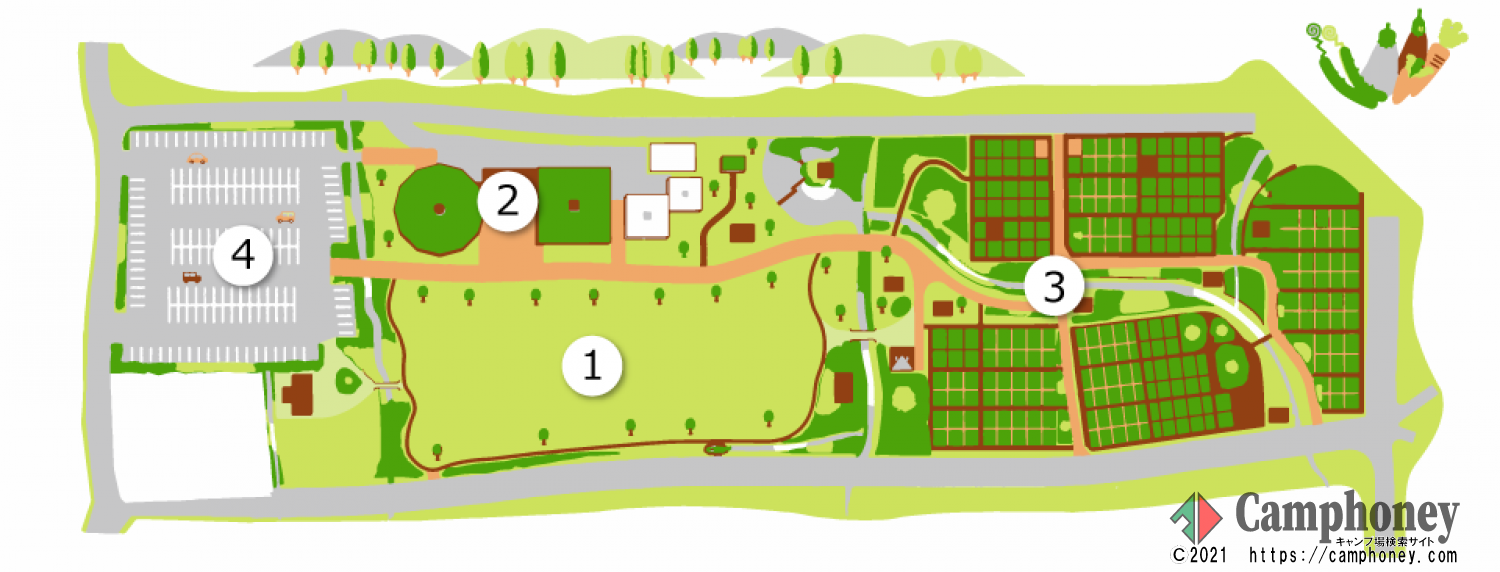 ①ふれあい広場 ②棟施設 ③市民ふれあい農園 ④駐車場