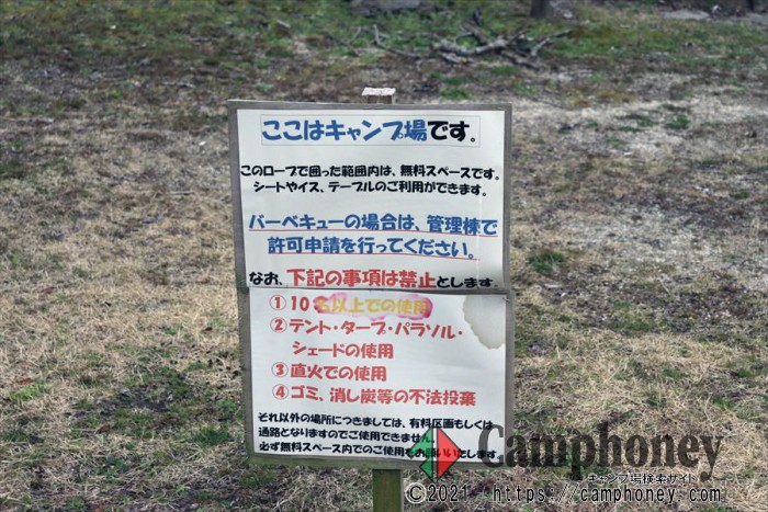 川沿いでロープに囲まれた指定範囲内であれば無料スペースとなっています。但し、そんなに広くはありませんので混み合う時期はテントが設営できるスペースがなくなる可能性はありますのでご注意下さい。