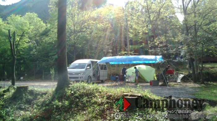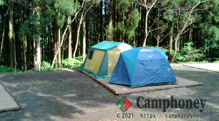 テントサイトはドングリの木々に囲まれた静かな空間です。 |