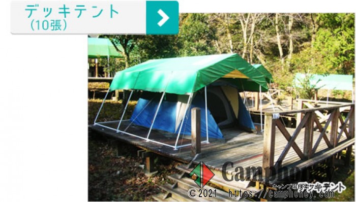 案内文 ご自分でテントを張って頂く場所です。テントを張る場所がデッキの上にあるため、雨が降ってもテントが濡れることなく、下から水が染み込むことも無い場所です。初心者の方や小さなお子様のいる家族連れにも安心してご利用いただけます。専用炊飯棟、専用トイレがそばにあり、快適なキャンプができます。デッキテントそばにテーブルがあり、星を眺めながらお酒を飲むと、話も盛り上がると思います。是非、いこいの森の夏を楽しんでください。 |