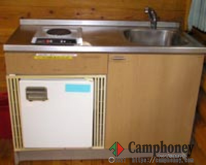 103号は他のバンガローと異なり、丸太で組まれたログタイプです。 ダイニングキッチン・洗面台・トイレ・お風呂があり、就寝スペースも兼ねています。