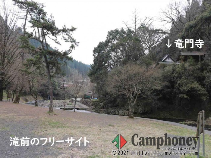 龍門の滝(竜門の滝)の目の前の広場で持込みテント泊が可能です。予約不要で大人300円、子供200円と激安です。但し、無料駐車場から5分程度徒歩で荷物を運ぶ必要があります。