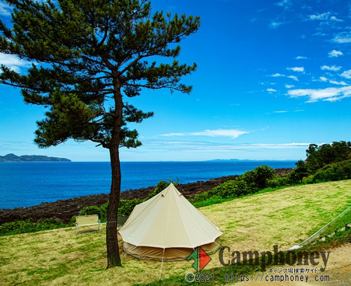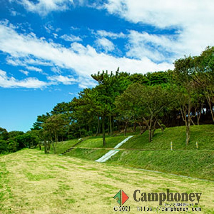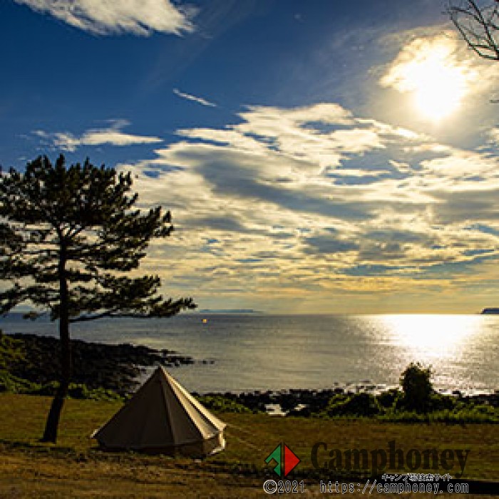 案内文 区画が区切られていない一面芝のサイトです。場所選び、レイアウトなど自由度が高く、サイトから直接サンセットが眺められるエリアです。