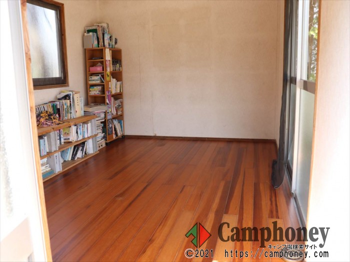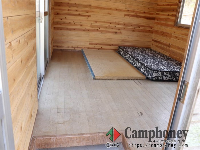 管理棟付近のバンガローです。4.5畳の床です。畳が2畳分ひいてあります。小さなテラス付きです。2,4,5,7番は内壁を2019年にリフォームしました。 水場が遠いです。(徒歩2~3分)キャンプ場内のなかで日が射すのが早い場所です。 4.5畳(2~5人用)