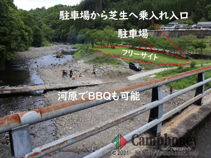 気軽に利用できて車両横付けはできないがすぐ隣が駐車場です。大分ではソロやグルキャンに人気な無料キャンプ場の1つです。