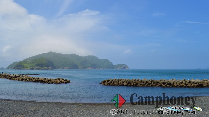 キャンプ場は鶴見半島の先端、九州最東端の海水浴場である下梶寄海水浴場にあります。 北側海岸にある管理棟横に狭いサイトスペースがありますが、反対側の駐車場奥にテント設営に適したもっと広い土の地面の空地があります。