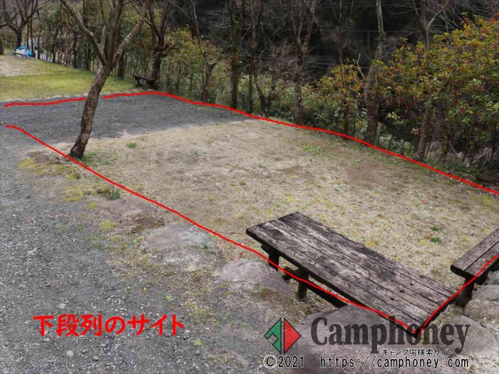 車1台+テントスペースの区画サイトです。 AC電源は利用時は別途+1000円。オートキャンプサイトの温泉は無料です。