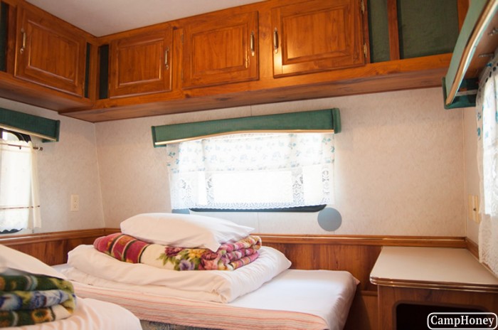 トレーラーハウスに広いリビングが付いたお部屋です。キッチン・冷蔵庫・食器・調理器具完備で自炊もOK。別荘感覚でお気軽にご利用ください。バスルームなし。受付や安心院温泉より150メートルほど。