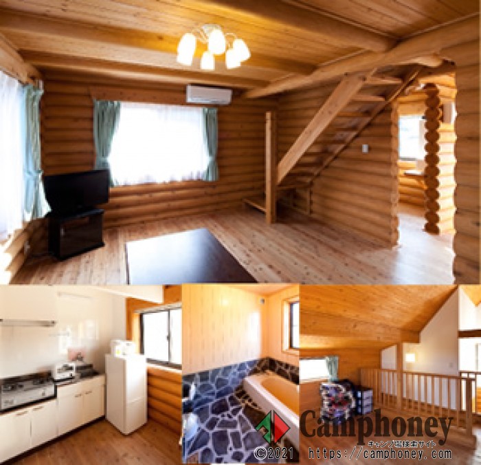 ログハウスは6人棟と8人用の2種類があり、どちらも木の香りに包まれた清潔な空間です。 キッチンには、冷蔵庫、炊飯器、調理器具や食器も一式揃っています。内風呂もあり、2階にはロフトスペース、寝具も揃っています。 冷暖房完備なので、年中快適!夏・冬、お子様連れでも安心です。 ログハウスの外には、雨が降ってバーベキューができる屋根付きスペースや本格的なアウトドア料理を楽しめる屋外グリルも設置しています。